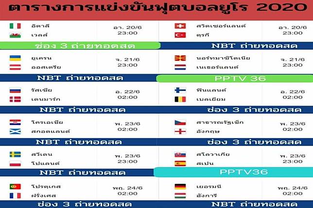 Source: cms.dmpcdn.com กลุ่มทรูขอมอบความสุขให้กับแฟนบอลชาวไทยและสมาชิกทุกท่าน ติดตามการถ่ายทอดสดศึกฟุตบอล ยูโร 2020 แบบเต็มอรรถรส ตลอดทัวร์นาเ. บีจี ปทุม ยูไนเต็ด 21:00 เวียตเทล เอฟซี. Nbt ยืนยันถ่ายทอดสดศึก ยูโร 2020 ทุดนัด เริ่มคู่แรก อิตาลี ดวล ตุรกี คืนวันศุกร์นี้ ตีสอง. Euro2020 โดยวันนี้ แข่งขันทั้งหมด 3 คุ่. ตารางการแข่งขัน ยูโร 2020 ถ่ายทอดสดช่อง nbt 2hd ทุกคู่ แข่งกี่โมง เช็คได้เลย!